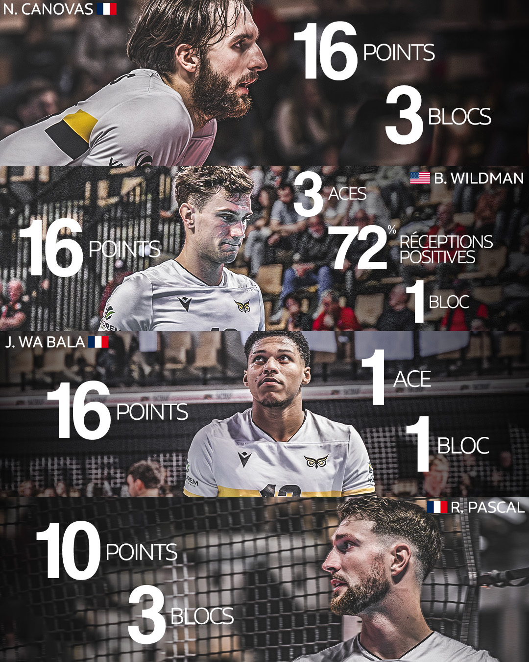 En difficulté sur les ailes, le passeur niçois Wessel Keemink choisit de privilégier le centre, où l’international américain Merrick McHenry brille. En face, Max Elgert varie son jeu et n’hésite pas à utiliser la pipe pour déstabiliser le bloc niçois. Soulagés en réception par un Julian Debes omniprésent sur la ligne arrière, les réceptionneurs-attaquants Wildman et Canovas (16 points chacun) peuvent se concentrer sur l’attaque avec réussite.